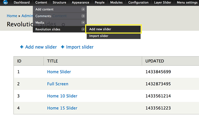 To get started, from the admin toolbar, click the Content >> Revolution slides >> Import slider