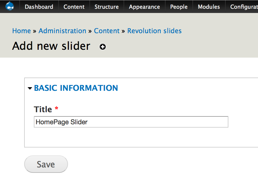 To create a new slider, on admin toolbar choose Content => Revolution sliders => Add new slider: