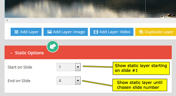 Static Layers are useful for when you have content that you'd like to appear at all times. For example, maybe you have a slider with 5 slides, but want to show your logo on top of the slider no matter what individual slide is present. In an example like this, you could add your logo as a "Static Layer".