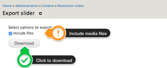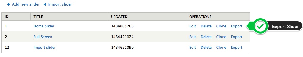Sliders can be exported and then imported. This is useful for creating a backup of the slider, and also for transferring a slider from one domain to another. To export a slider, visit your sliders list, and click the "Export Slider" button. This will create a zip file of your slider, that can be saved on your computer for importing at a later time.