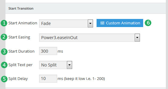 - Split Delay: The time (in milliseconds) between each animation when one of the "Split Text" options is used. For example, if "Split Text per -> Char Based" is selected, and the number "10" is entered here, the letters will animate one after the other every 10 milliseconds. Usually "200" or below is best.
